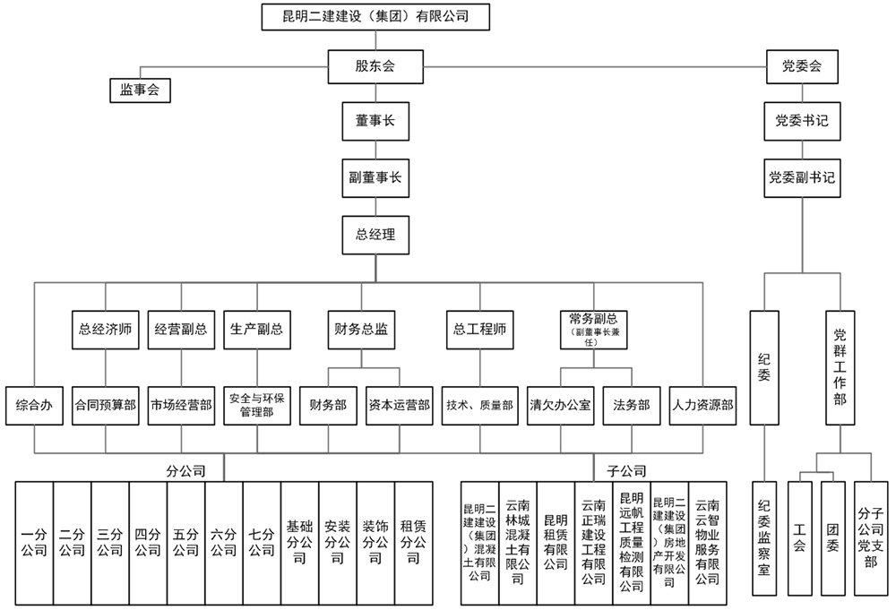 公司設(shè)置12個(gè)職能管理部門,分別為綜合辦公室、合同預(yù)算部、市場(chǎng)經(jīng)營(yíng)部、財(cái)務(wù)部、資本運(yùn)營(yíng)部、安全環(huán)保部、技術(shù)、質(zhì)量部、清欠辦公室、法務(wù)部、人力資源部、黨群工作部、紀(jì)檢監(jiān)察室;設(shè)立11家分公司,分別為一分公司、二分公司、三分公司、四分公司、五分公司、六分公司、七分公司、基礎(chǔ)分公司、裝飾分公司、安裝分公司、租賃分公司共計(jì);下設(shè)7家子公司,分別為設(shè)立云南正瑞建設(shè)工程有限公司、昆明二建建設(shè)(集團(tuán))混凝土有限公司、云南林城混凝土有限公司、昆明租賃有限公司、昆明二建建設(shè)(集團(tuán))房地產(chǎn)開發(fā)有限公司、昆明遠(yuǎn)帆工程質(zhì)量檢測(cè)有限公司、云南云智物業(yè)服務(wù)有限公司(其中除云南云智物業(yè)服務(wù)有限公司為參股公司外,其余6家公司均為公司全資子公司)。